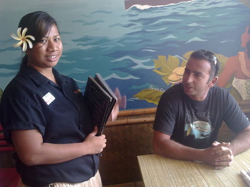 O dia termina com uma jantarada no Pizza Bob's em Haleiwa. Comida excelente, belo ambiente. O tinto "La Terre" recomenda-se e os meus dotes de francês, explicando à empregada o que significa a marca do vinho, faz a proprietária nos vir conhecer pessoalmente. Oh lá lá!!
