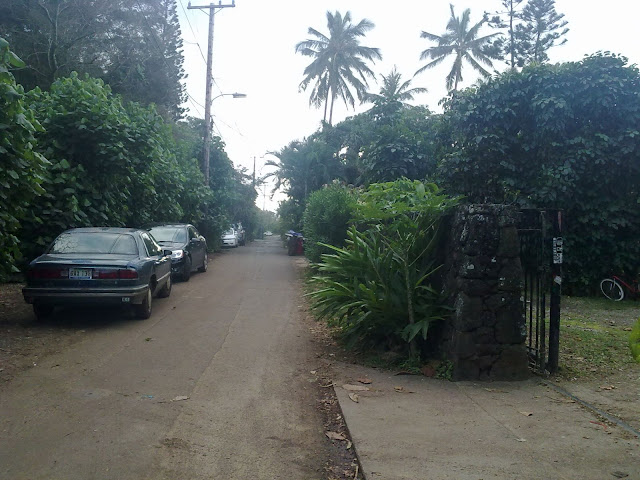A seguir a Waimea, onde estávamos alojados, surge uma recta rodeada de verde por todo o lado. Algumas casitas do lado esquerdo, que escodem os mais famosos picos do mundo: Gas Chambers, Off the Wall, Pipeline, Rocky Point, Sunset. Uma escola, um posto de bombeiros. Uma bomba de gasolina e um supermercado - Foodland o mais caro do mundo - c/ o inevitável starbucks.